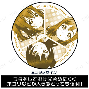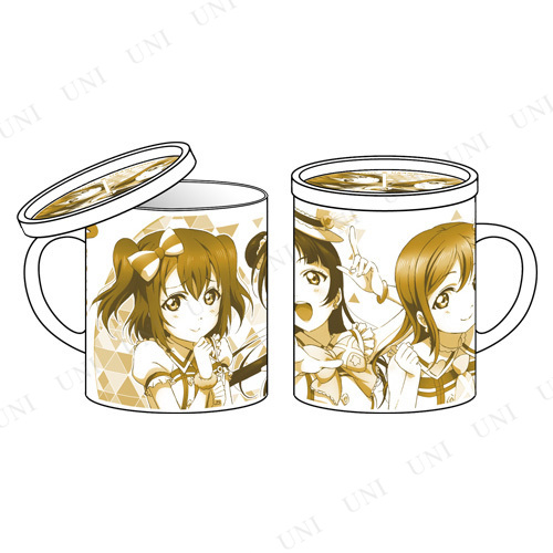 Aqoursのメンバーと一息つきませんか?便利なふた付きのマグカップです。フタ部分はフチが高くなっているので、ティーバッグやお菓子を置くための小皿としても使用できます。また、蓋をしておく事で飲み物を冷めにくくし、ほこりの混入も防いでくれます。学校や会社、ご自宅などでのティータイムにどうぞ