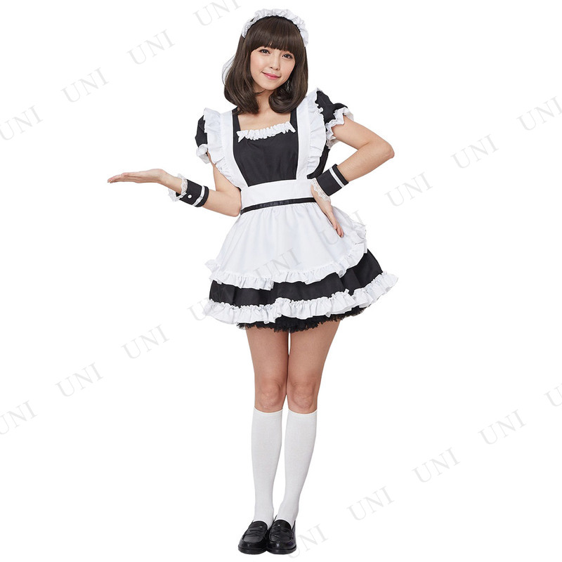 たくさんのフリルがポイント!定番カラー、白×黒のメイドコスチュームです。可愛いカフスもついたボリューム満点なセット。ハロウィン仮装やコスプレイベントなどにおすすめ!