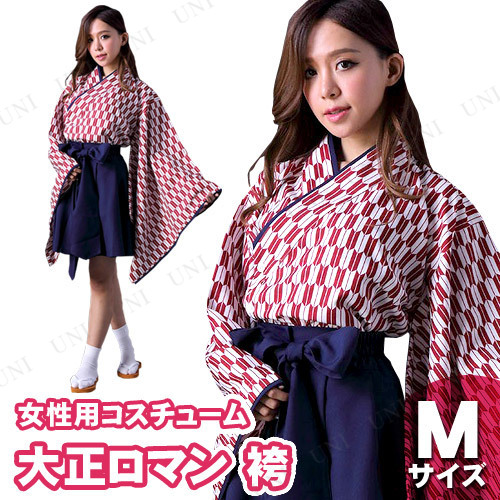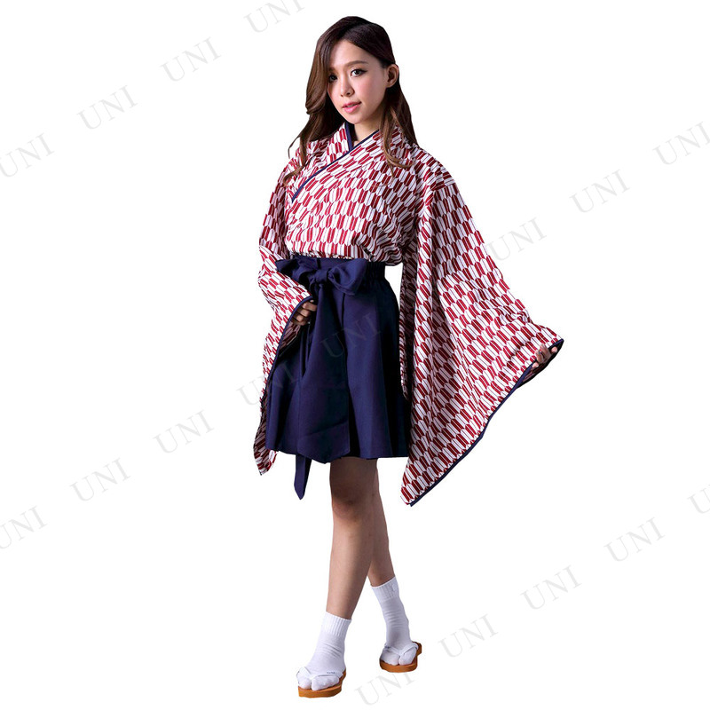 レトロな大正ロマン風の衣装です。矢絣(やがすり)模様の羽織に、ミニ丈の袴のセット。帯も簡単な作りで手軽に着ることができます。和風な衣装がお好きな方や、文化祭やイベントでのおそろい衣装にもオススメ