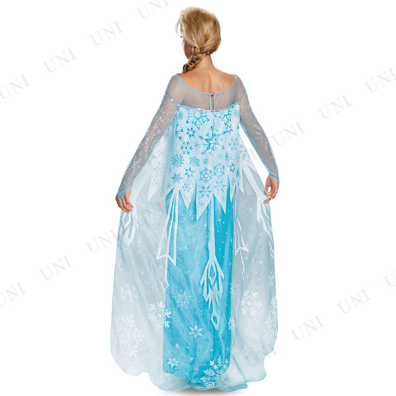 ディズニー映画「アナと雪の女王」より、エルサの大人用コスチュームです。雪の女王の世界観を表現したブルーのドレスに、レースに描かれた雪の結晶が素敵なデザイン。パーティーやイベントでの仮装、コスプレにどうぞ