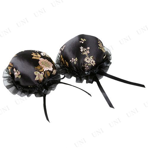 チャイナドレスにピッタリのお団子風ヘアアクセサリーです。綿入りで最初からお団子の形になっているので、頭にピンで取り付けるだけでセット完了。華やかな花柄入りのサテン生地とオーガンジーのフリルで高級感のあるデザインです