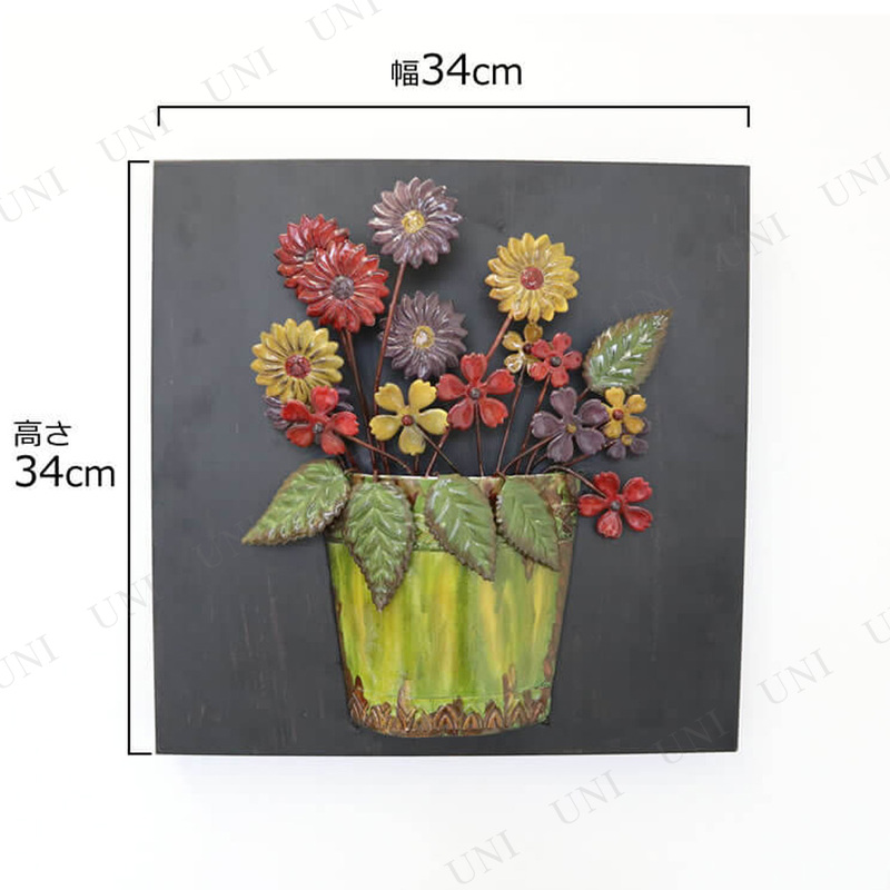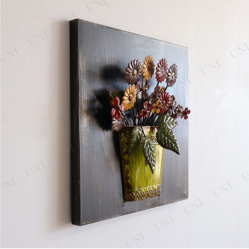 アンティーク調の壁掛けパネル。スクエア型の小さめで飾りやすいサイズ。色々なカラーが混ざった花と花瓶をモチーフにしています。擦れのあるハンドメイトの風合いで落ち着いた雰囲気