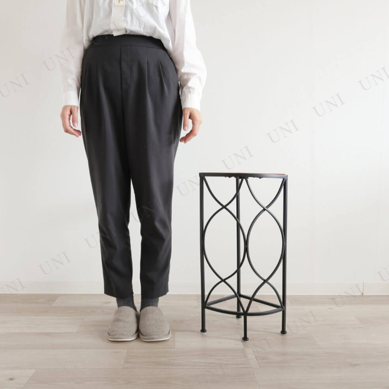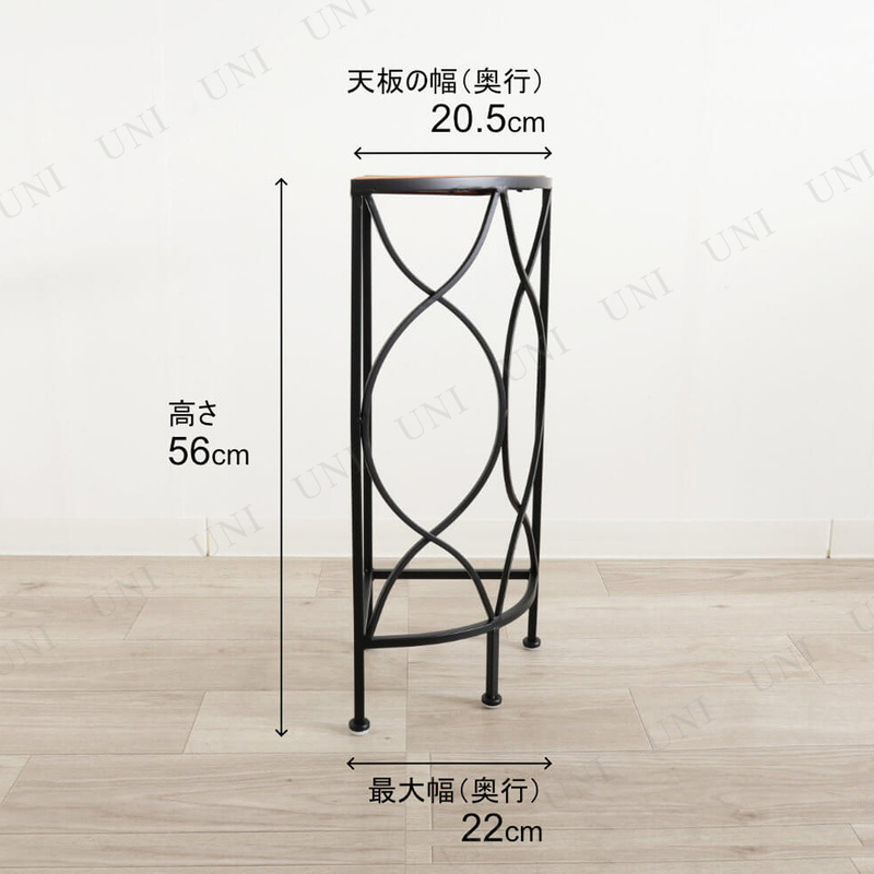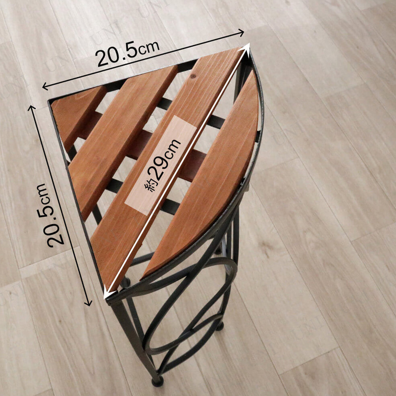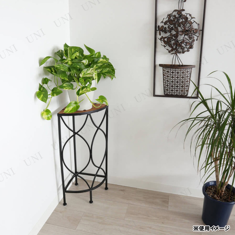 アイアン製のクォーターサークル型フラワースタンド。ブラウンの木目天板が可愛らしく優しいデザイン。花や観葉植物を飾る理想的なスペースを作り、空間に自然な温かみのあるスタイルを加えてくれます