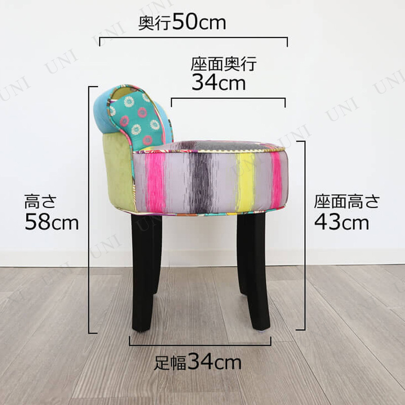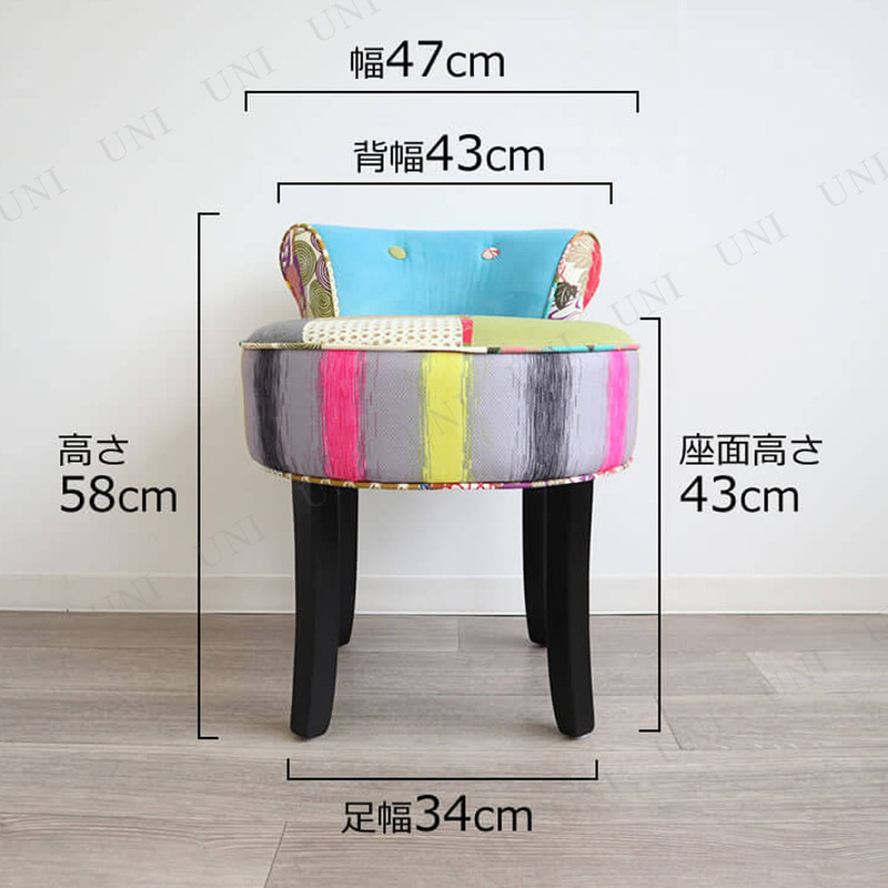 個性的で可愛らしいパッチワークのチェアー。個性的な柄は、すべてを詰め込んだ贅沢なデザインで見る人、座る人の心を奪います。パッチワークなので、柄にちょっとした違いがあるのも素敵ポイントが高いです