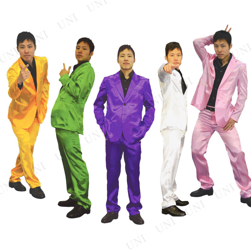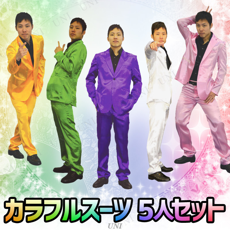 注目度No.1のカラフルスーツ豪華5人セット!!イエロー、グリーン、パープル、ホワイト、ピンクの各カラー1着ずつの5着セットです。宴会の司会、余興、ダンス、舞台などいろんなシーンで使えます。みんなで着ればアイドルグループに変身できるかも!?