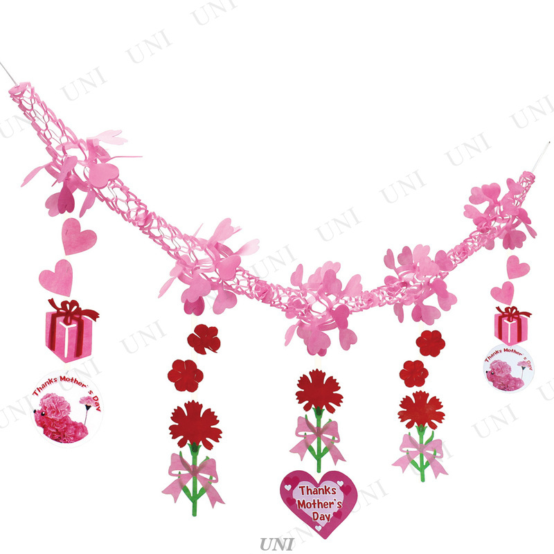 カーネーションやプレゼントで構成されたガーランド。カーネーションのプードルのアイコンが可愛い!母の日シーズンの店内装飾用にいかがですか?