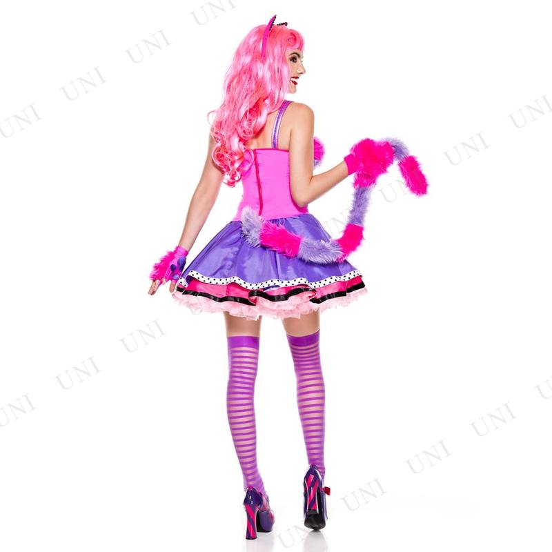 童話「不思議の国のアリス」より、チェシャ猫の女性用コスチューム。ワンピース、ネコミミカチューシャ、チョーカー、グローブ、尻尾、ニーハイソックスのセットです