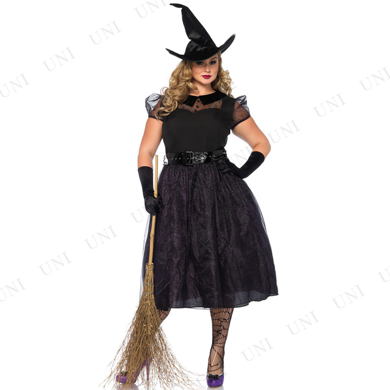 大人用の魔女コスチューム。グリッタースカートのドレスに、とんがり帽子、ベルトのセットです。別売りの魔女ほうきを持てば更に雰囲気UP!