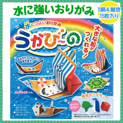水に浮かびます!お風呂やプールなどで遊べる水に強い折り紙セットです。ふねやラッコ、カメなど、上手に折って、浮かべて遊ぼう!5柄&無地折り紙15枚入り。ピョンピョンカエル・ペンギン・ふうせんの折り図付きです