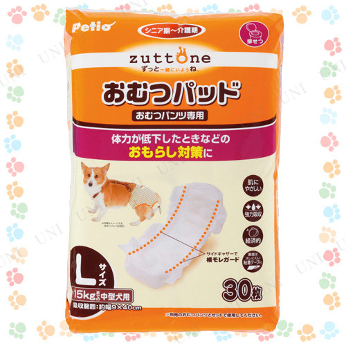 別売りの「おむつパンツ L」(PW-83970)専用のパッド30枚セットです。ワンちゃんの体力が低下したときなどのおもらし対策に。サイドギャザーで横漏れをガードし、高性能ポリマーが尿素を素早く吸収しゼリー状に固め、逆戻りしません。ポリマーが嫌なニオイを閉じ込めます。パッドの表面を白色で仕上げているので尿の色をチェック出来ます。ズレにくい粘着テープ付き