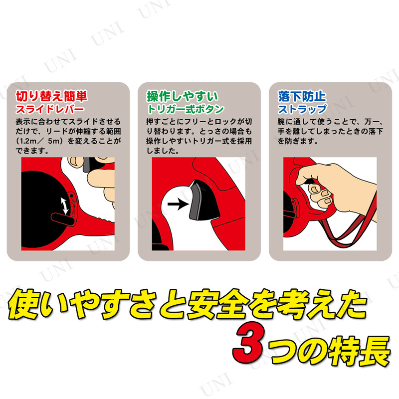 お散歩では1.2m、お遊びには5mとシーンに合わせて長さを選ぶことができる2段式リードです。スイッチ一つで切り替える事ができます。ロックスイッチは操作しやすいトリガー式ボタン。落下防止にストラップがついています