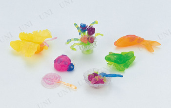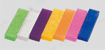 おゆまる(7色:黄緑・透明・紫・黄・オレンジ・ピンク・青)。熱いお湯(80℃以上)を入れ、3分位(冬は5分以上)で柔らかくなります。水気をよく拭き取り、柔らかいうちに好きな形を作ります。よくはずむスーパーボールもできます!※写真は作品例です。