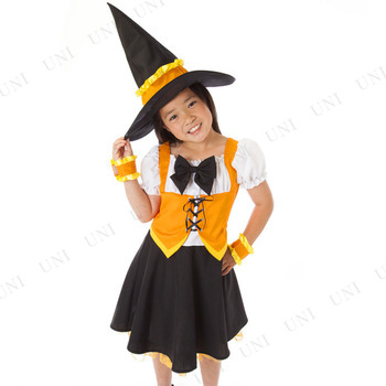ポップなカラーが可愛い、とんがり帽子がセットになった子供用ウィッチドレスです。コルセット風のコスチュームになっています。両手首のカフスがアクセントに♪