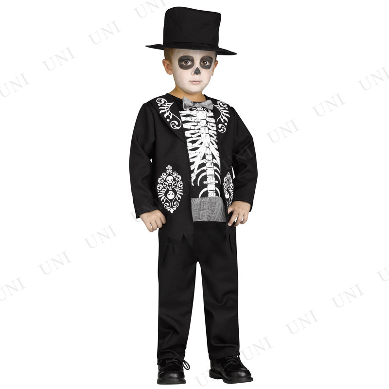 死者の日にぴったりな紳士スタイルの子ども用ガイコツコスチューム。ジャンプスーツと帽子のセットです