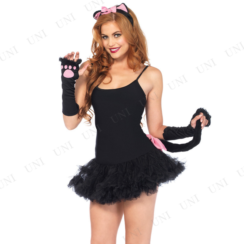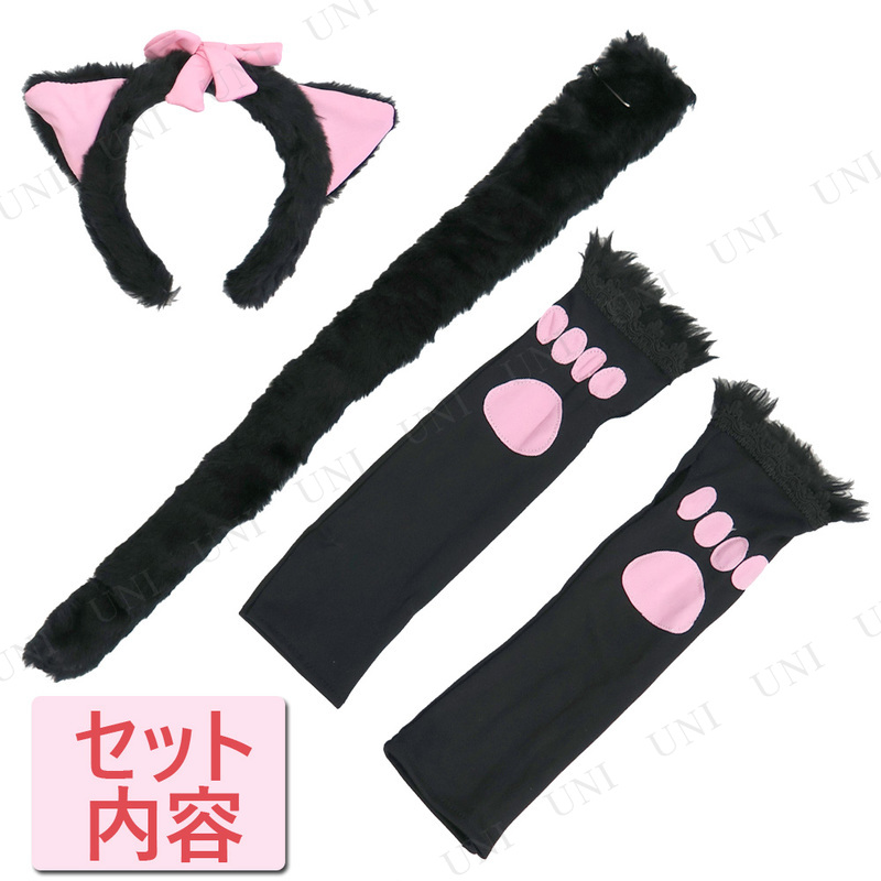 手持ちの服装と合わせて黒ネコの仮装ができるアクセサリーキット。猫耳カチューシャ、フィンガーレスグローブ、シッポのセットです。ピンクのリボンと肉球がキュート!