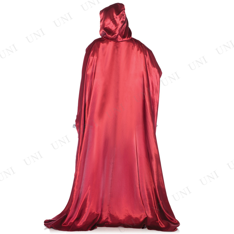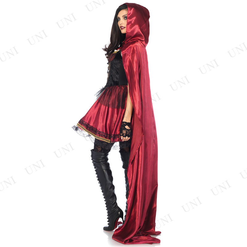 光沢あるサテン生地が艶やかな赤ずきんコスチューム。アクセントに使った黒のレースがとってもセクシーなワンピースとフード付きロングケープのセットです