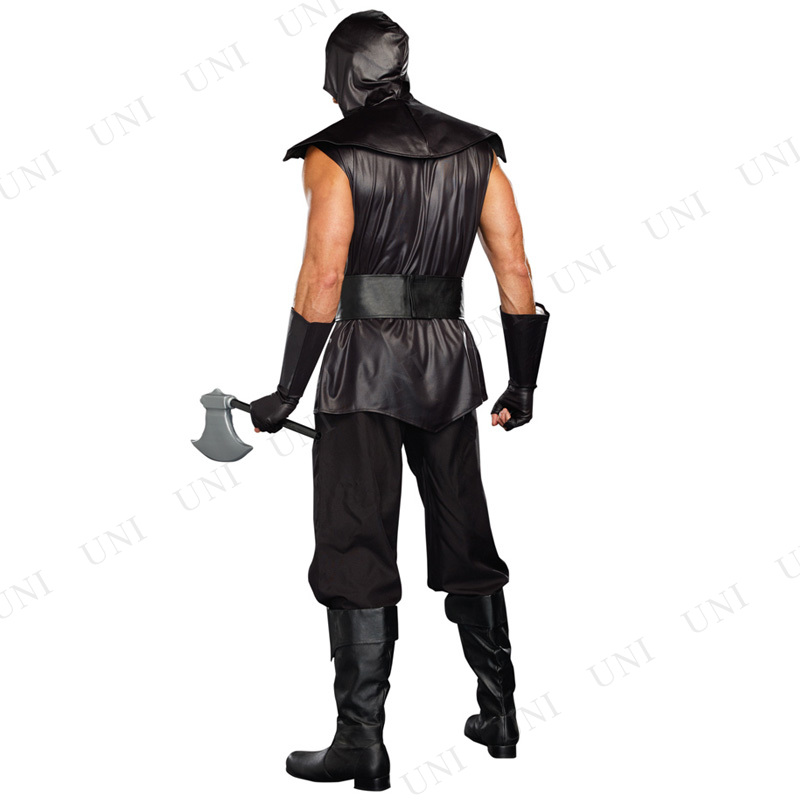 闇に潜む暗殺者になりきれるアサシンコスチューム。レザー風のフードマスク付きチュニック、フィンガーレスグローブ、武器を通せるループ付きベルト、手斧のセットです