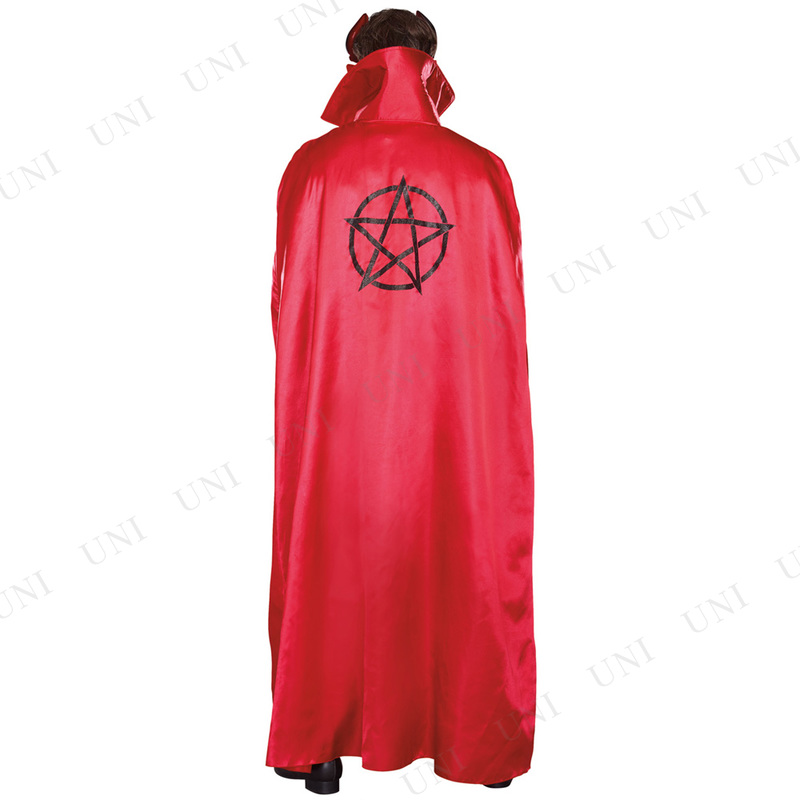 マスク付きの悪魔コスチューム。真っ赤なロングマントの背中には魔術の記号とされる五芒星がプリントされています。真っ赤なベルベットのベストとレッドデビルマスク付きです