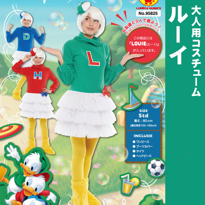 他のチームとちょっぴり差をつけたい方におススメ!ドナルド・ダックの甥で、いたずら好きなアヒルの三つ子の一羽、ルーイのコスチュームです。お尻のもこもこ感をキュートな3段フリルで表現したかわいいデザイン。キャスケット風のヘッドピースやブーツカバーも入ったフルセットだから届いたその日から変身できます。デューイとヒューイもご用意しているので双子コーデならぬ3つ子コーデで楽しんでみてはいかが?