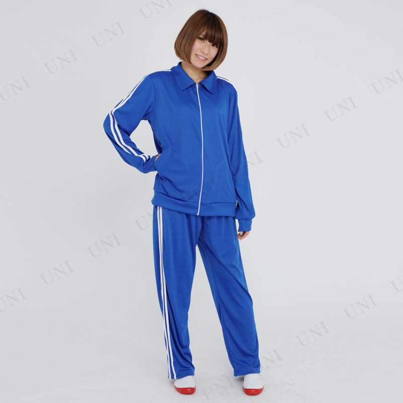 昔懐かし高校ジャージ。スタンダードな青色です。みんなでお揃いで着用して運動できない芸人コントなどしてみては?