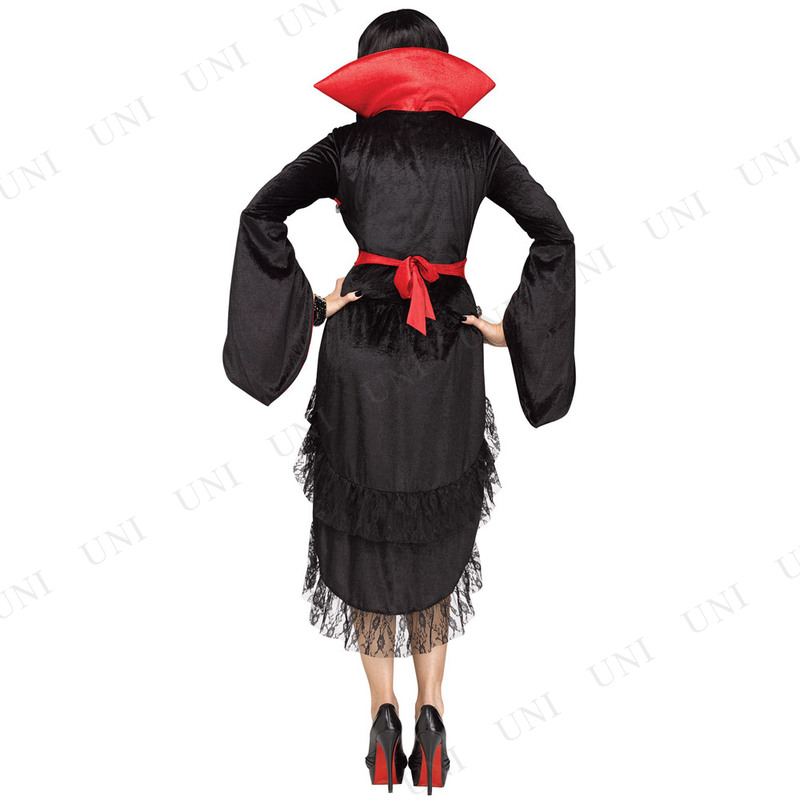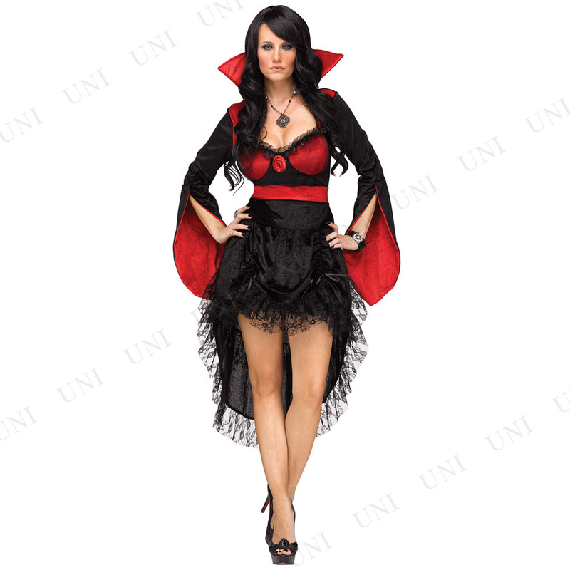 胸元の赤い薔薇がポイント!セクシーな大人用バンパイアコスチュームです。胸元が大きく開いたフィッシュテールのミニ丈ドレス。立ち襟、裾のレースフリル、大きな袖口など贅沢なデザインです