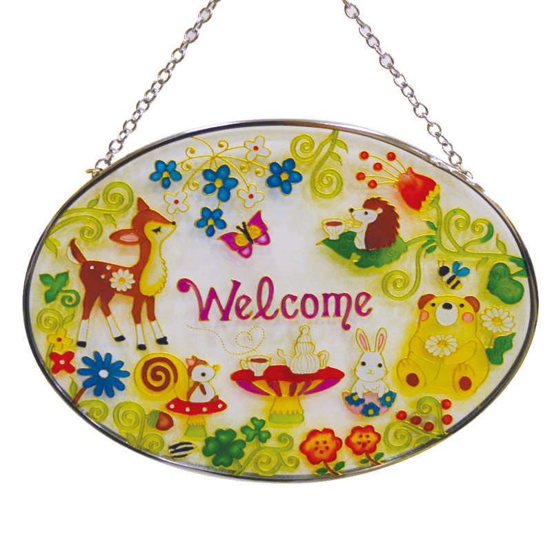 ステンドフレーム森の動物たちウェルカム楕円,インテリア雑貨,ガラス細工,ミニチュア,置物,サンキャッチャー,風水,小物