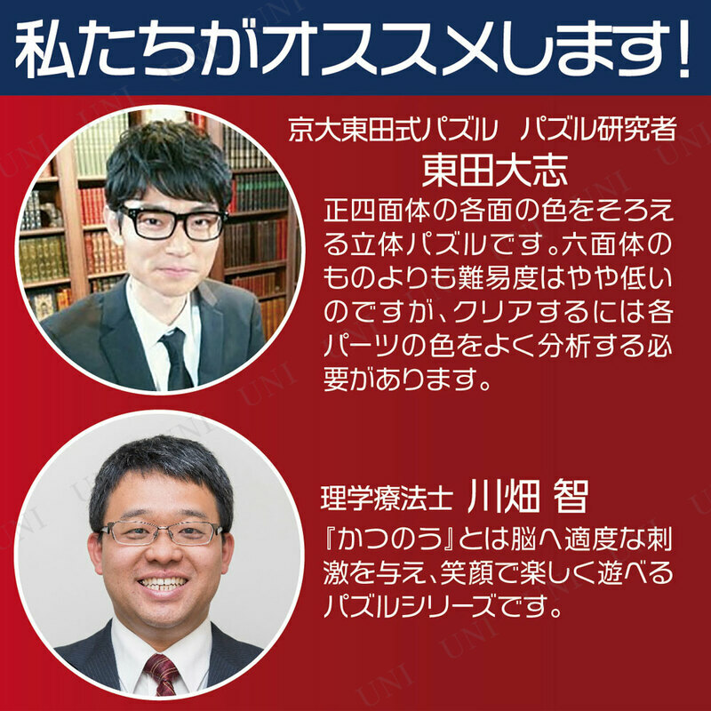ユニークな形状の立体パズル(メファートパズル)がかつのうに!正四面体の4面の色を合わせる立体パズル。6面体よりも比較的簡単に遊べるので、立体パズルのビギナーにオススメ!面を回転させる際のカチカチとした動きが心地よく、図形を回転させて次の位置やその先の位置を考えるので観察力も必要。脳の健康維持を意識して、脳の若返りを目指すパズル・エクササイズ「かつのう」シリーズ
