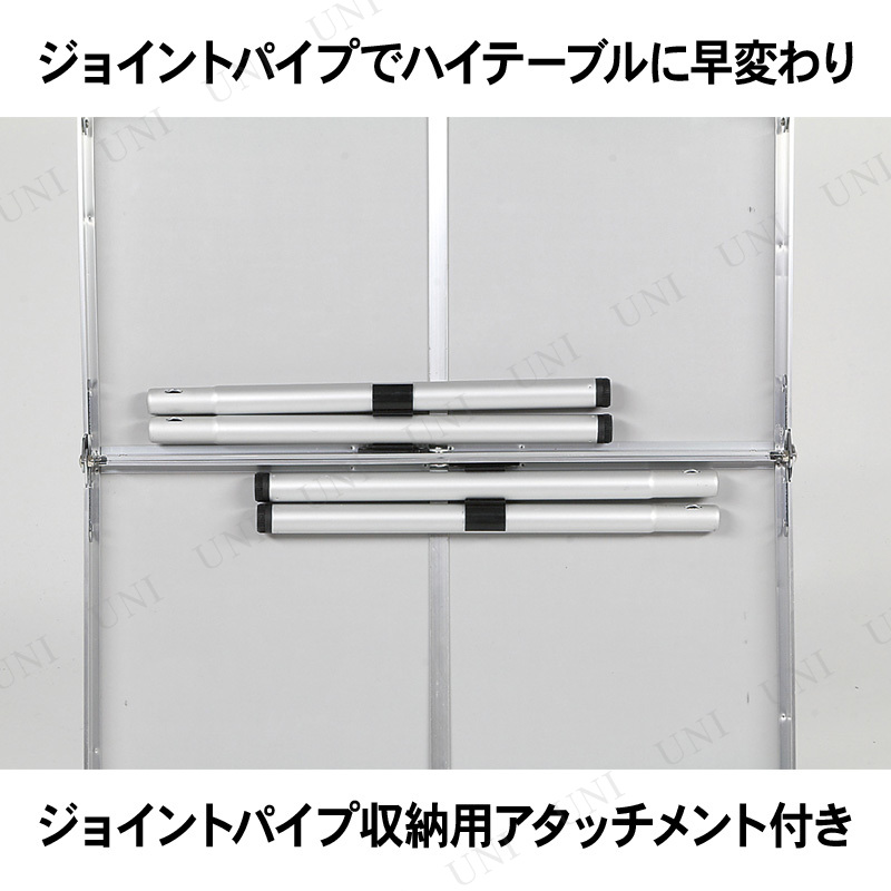 ハイ・ロー2通りの使い方ができる折り畳みテーブル。ジョイントパイプで2段階の高さに調節が可能。ロータイプ使用時には取り外したパイプを天板裏のアタッチメントに収納できます。ジョイントパイプを外し、脚部を折りたたむだけのシンプルな構造なので組立、収納が簡単。合板とアルミ脚を使用しているので軽くて丈夫、天板裏とアルミ脚は補強付なので強度がアップしています。持ち運びに便利な取っ手付